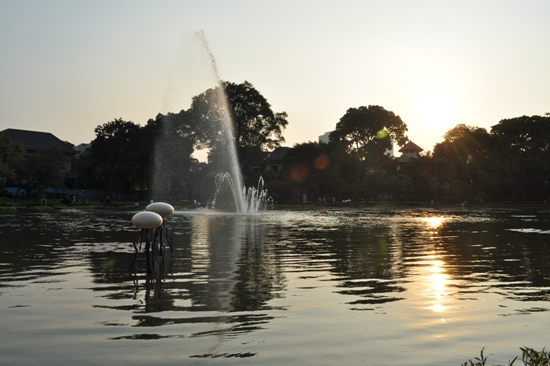 Ada nilai plus juga dari taman ini, pengamen maupun tukang jualan keliling memang tak sebanyak taman suropati maupun taman menteng, selain itu juga tak banyak orang yang berkunjung kesini, mungkin karena adanya portal yang tutup sekitar jam 20.00 cukup membatasi waktu berkunjung ke taman tersebut. Walaupun begitu, anda bisa sekedar jogging sembari menunggu maghrib tiba. Situasi matahari sedang terbenang nampak cantik, terpantul dari dalam danau, apalagi dengan lampu taman yang cantik, cukup menambah keindahan taman tersebut.