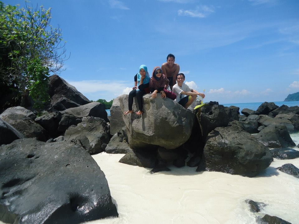 Panasnya matahari disana bikin kulit saya makin eksotis aja hehe. berada lama di pulau umang, saya merasa benar-benar seperti berada di surga dunia, pasir yang putih, bebatuan yang cantik, terumbu karang yang indah, apalagi pemandangannya dengan view pegunungan dan laut birunya dijamin ga akan garing deh disana tapi jangan lama-lama ya disana nanti ketinggalan perahu lagi soalnya ga ada penghuni di pulau itu bisa-bisa kita terdampar lagi hehe.